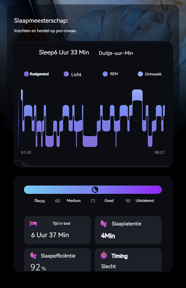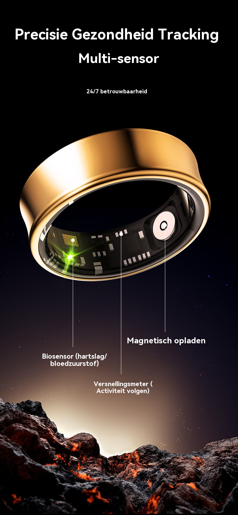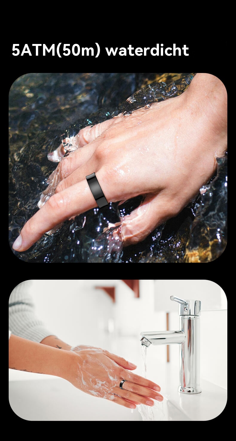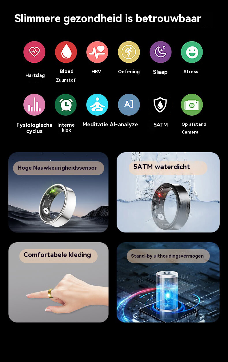 AI-analyse, slaaptracking (24/7 + dutje),hartslag (24/7), bloedzuurstof, HRV (24/7), stress, temperatuur, stappen, afstand, calorieën, meerdere sportmodi (128 sporten), menstruatiecyclus
