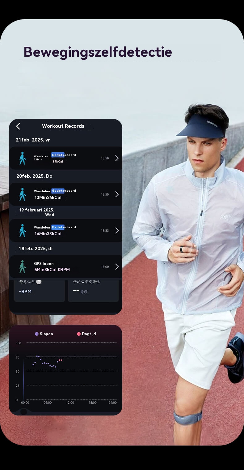 Selecteerbare hartslag: 5 minuten, 10 minuten, 15 minuten, 20 minuten, 25 minuten, 30 minuten, 60 minuten